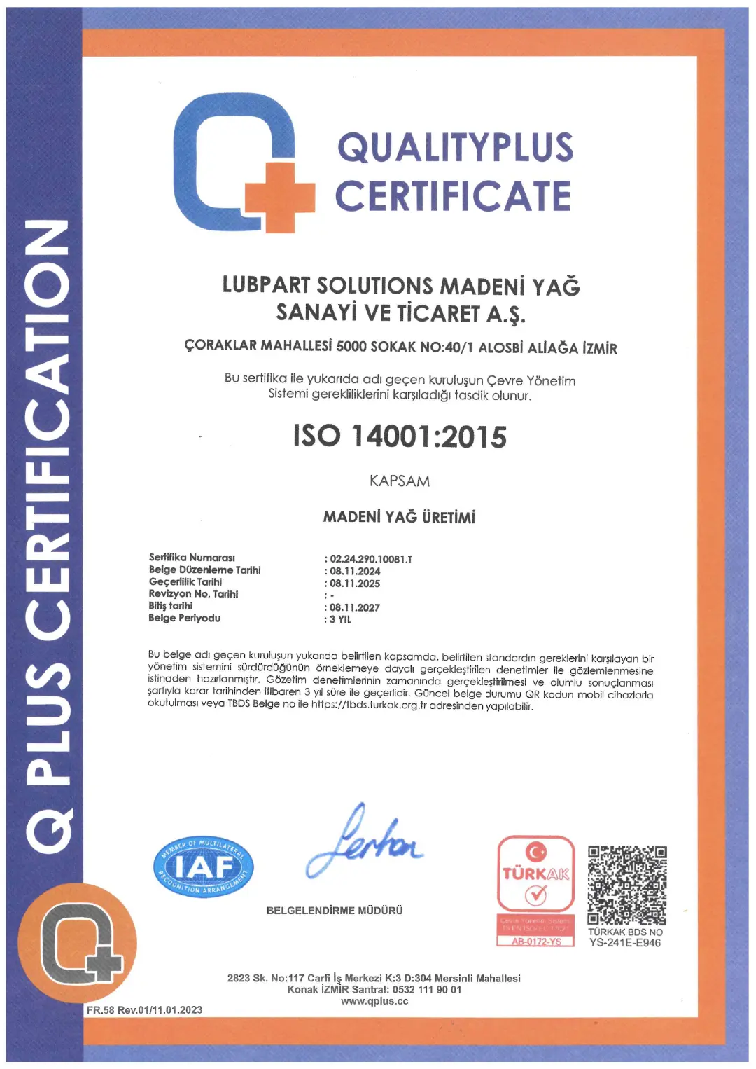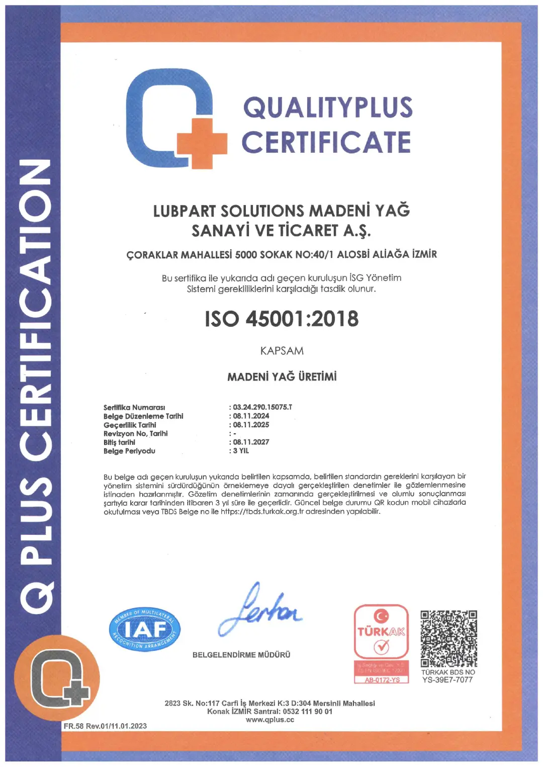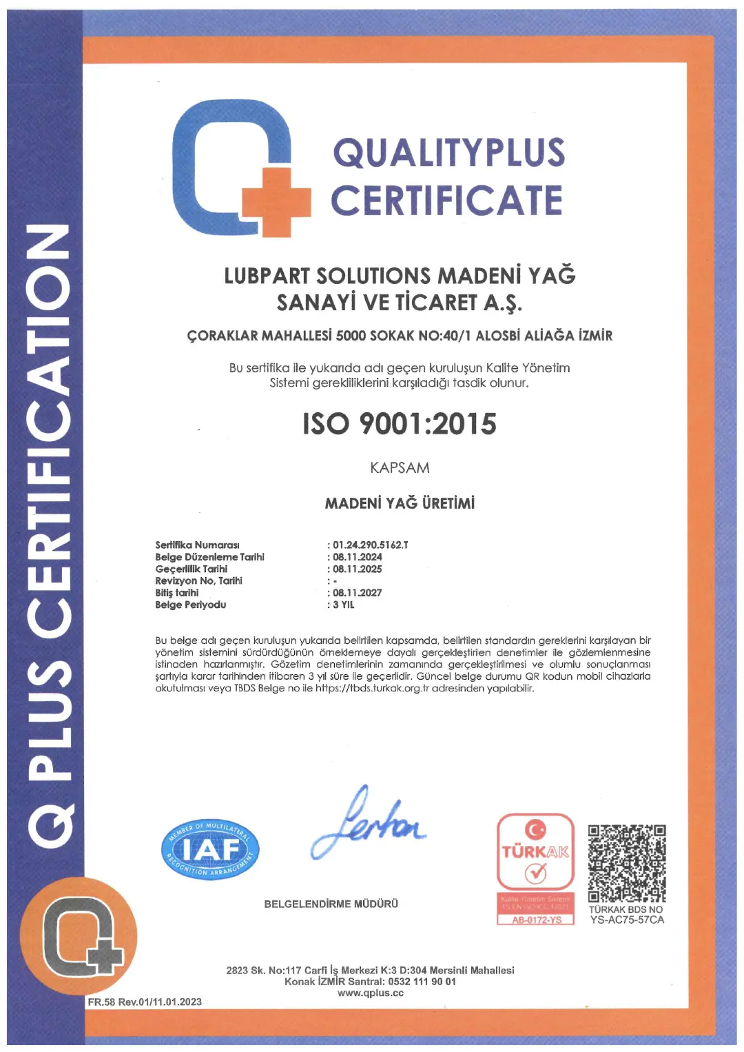 Bu sertifikalar aracılığıyla LUBPART aşağıdaki alanlarda kararlılığını ortaya koymaktadır: